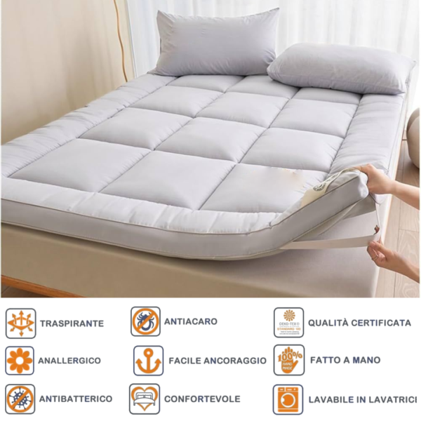 Il Topper ipoallergenico ti protegge da acari e batteri dei materassi, con innovativo supporto lombare ortopedico certificato grazie alla trapunta a quadri e all’imbottitura in piuma d'oca da 11 cm, con 4 potenti elastici di fissaggio è semplice da posizionare e rimane saldo e fermo, si lava comodamente in lavatrice